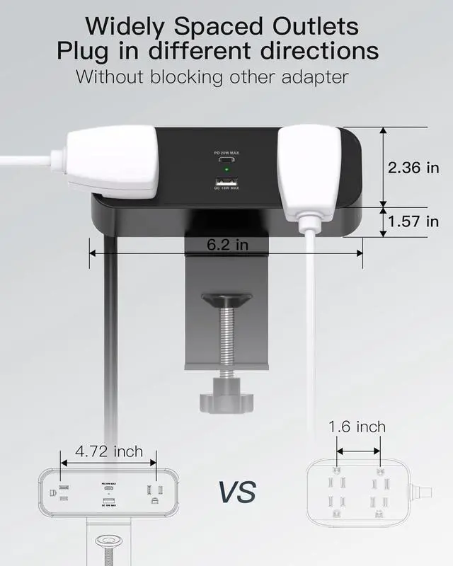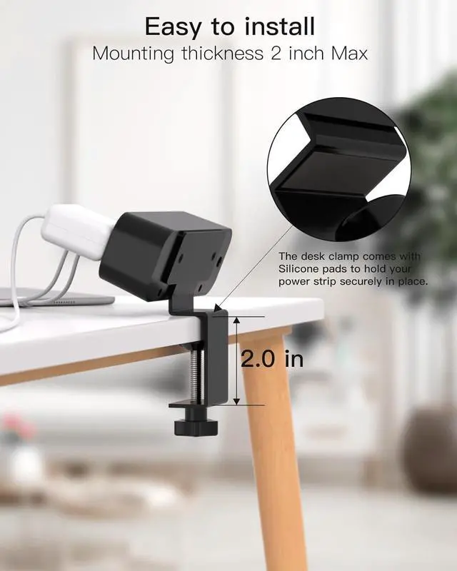 Easy to Install: No drill and screws required. Desk 10 ft power strip could be freely mounted and removed conveniently, just screw tight the clamp holder. A suitable range of clamping thickness: 2-inch max, Foam pads on the desk clamp protect the desk surface from scratches and scuffs.