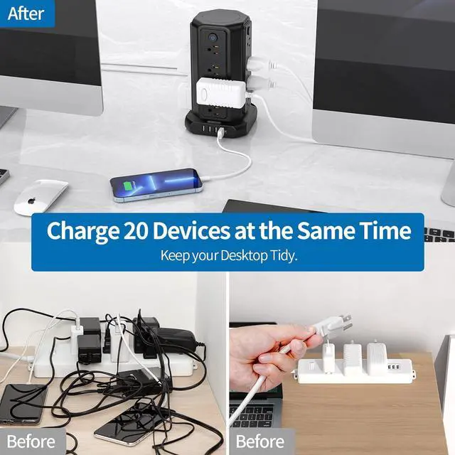 Real Spaced SaverUnlike regular surge protector extension cord, the vertical tower design for Equipped with an assortment of 16 AC sockets and 4 USB ports, this innovative power strip tower has sockets perpendicularly positioned to the floor, maximizing space compared to the conventional models. The ergonomic spacing and orientation of the sockets will allow better organization of the space as the whole system can be tucked away neatly into tight spaces and corners.