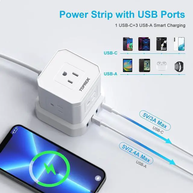 SMART USB CHARGING- The small power strip with 1 USB-C and 3 USB-A charging ports, built with smart IC technology. This is an " iSmart" charger, which means it automatically detects the optimal charging needs of any attached USB devices, and deliver appropriate current. You can easily charge your phone, kindle, and other USB-powered devices at optimal speed. This is a great accessory for your desk or nightstand, easily putting plugs and USB charging ports in arms reach.