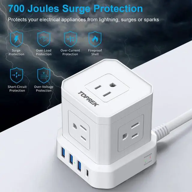 POWER STRIP WITH SURGE PROTECTOR- Features overheating protection, overload protection, minimum 700 joules surge protection, over-current protection, over-voltage protection, short-circuit protection, TOPREK USB power strip keeps you and your connected devices safe. The added bonus of 700 joules surge protection gives you peace of mind knowing your devices are protected from lightning, surges or sparks, let you are able to connect various devices safely.
