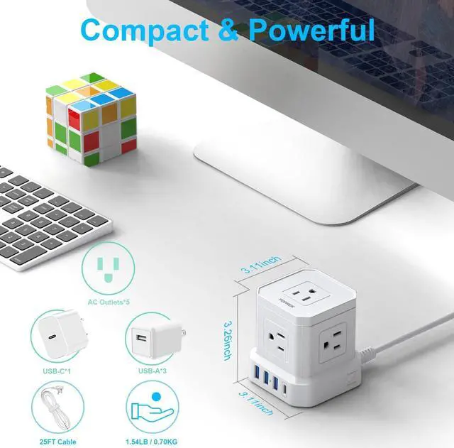 NO-BLOCKING & SPACE-SAVING DESIGN- The USB power strip comes in a shape of a cube, this unit has only one outlet per side providing room for bulky power blocks, you can conveniently place your electric equipment with ease and not having to worry about if they bump to each one or not fit when plugging them next to each other. Since its square, it takes up minimal space on your workshop table, and keep your desk neat. The small-profile 45°flat plug, allows it to be plugged into the top or bottom
