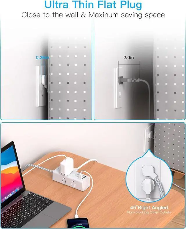 3 Side Space Saving Design & Widely Space Outlets 3-side design and each AC outlets with 1.6 inches space in between, larger than standard 1.5-inch socket, fit big adapters without blocking each other. The compact size (5.0*1.9*1.8 IN) takes up less space on your desk or luggege, essential for the travel, home, office, and college dorm.
