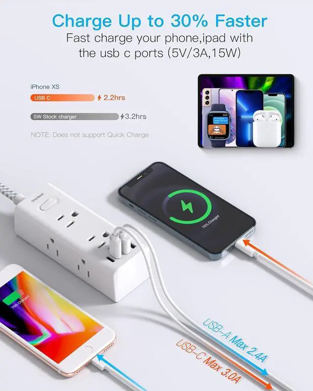 10-IN-1 Desktop Power Strip with USB C Fast Charge With 6 AC outlets, 2 USB ports and 2 USB C power strip, power up 10 devices simultaneously. USB C charging port features 3A Max, USB A charging port features 2.4A Max, With smart charging technology, it can auto-detect your connected devices and can reach faster-charging efficiency, which would charge your devices WITHOUT a variety of converters. Two mounting holes on back allows this power strip to be securely installed in various applications.