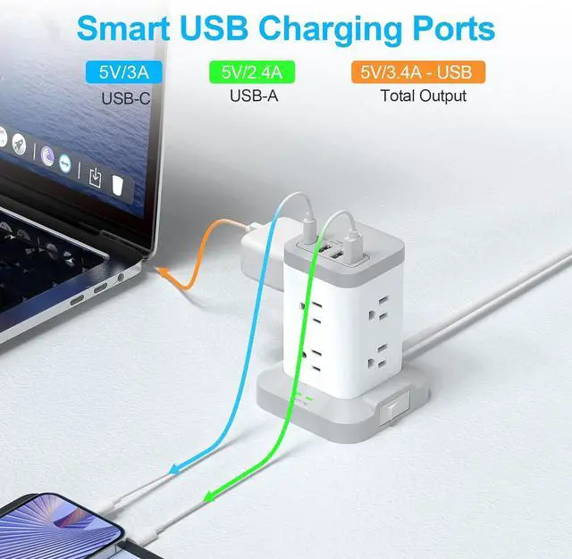 Extension Cord with Multiple Outlets This surge protector power strip tower has 8 outlets, and 4 USB ports which include 1 USB-C port. Wide voltage design of 100V-250V and 10A heavy-duty extension cord. 5V/ 2.4A max output per USB-A port, 5V/3A max output from USB-C port( 5V/ 3.4A in total)