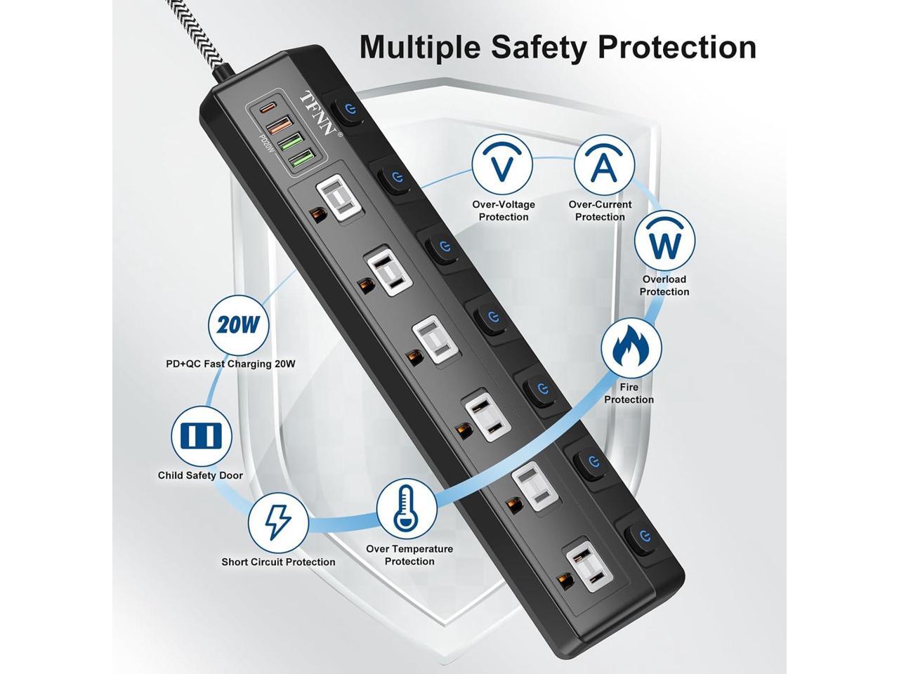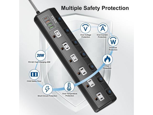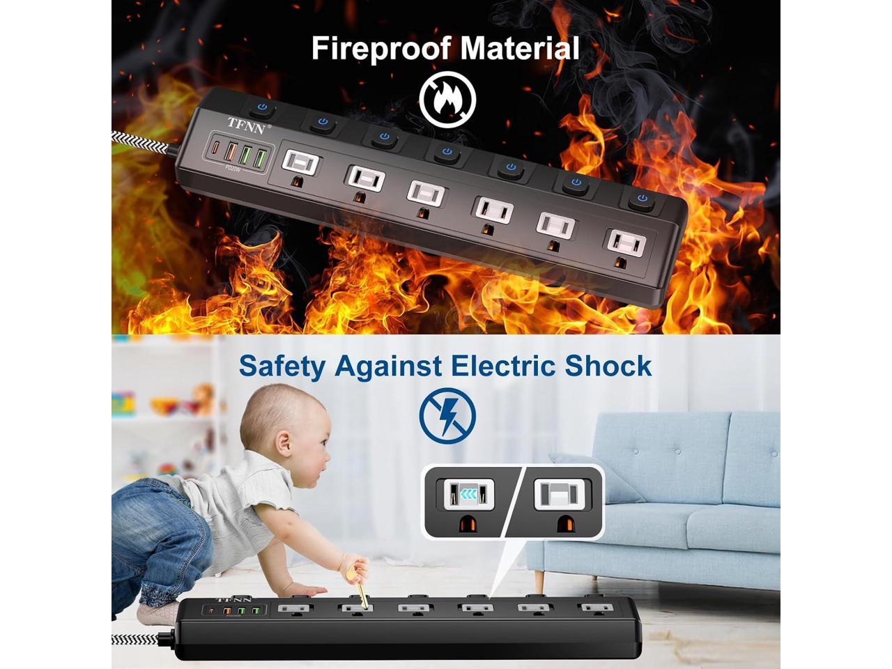 - Safety and Fire ProtectionTFNN extension cord is fully compliant with industry quality standards for extension cord in the USA. This product has passed UL, CE, FCC and RoHS certificates; the shell is made of high temperature resistant PC+ABS with V0 fire rating, which protects you from over-current, short-circuit and overload.