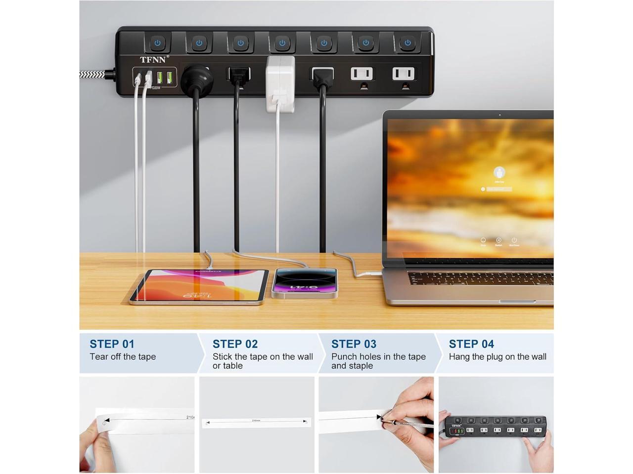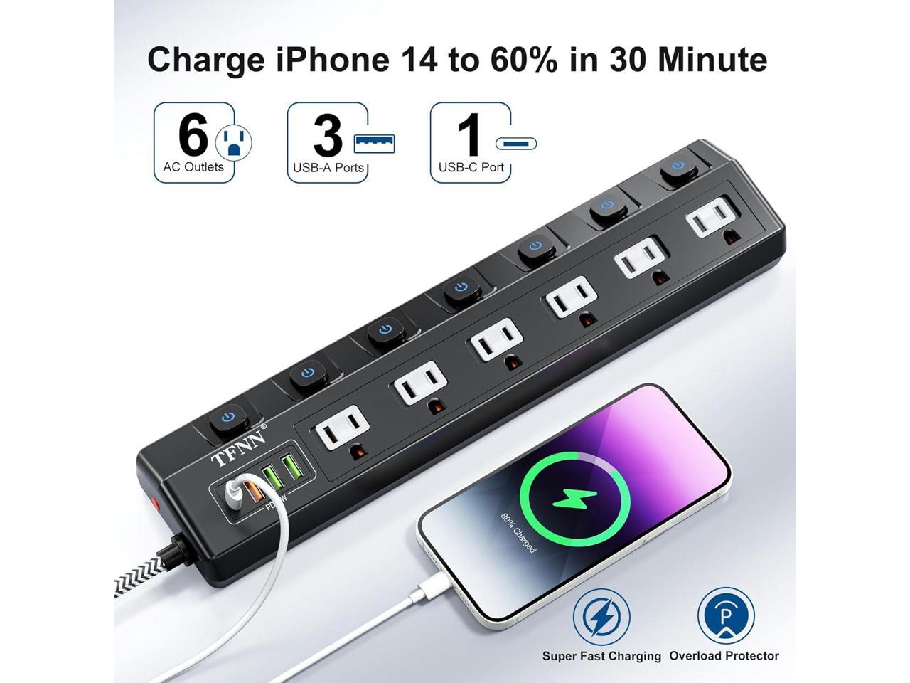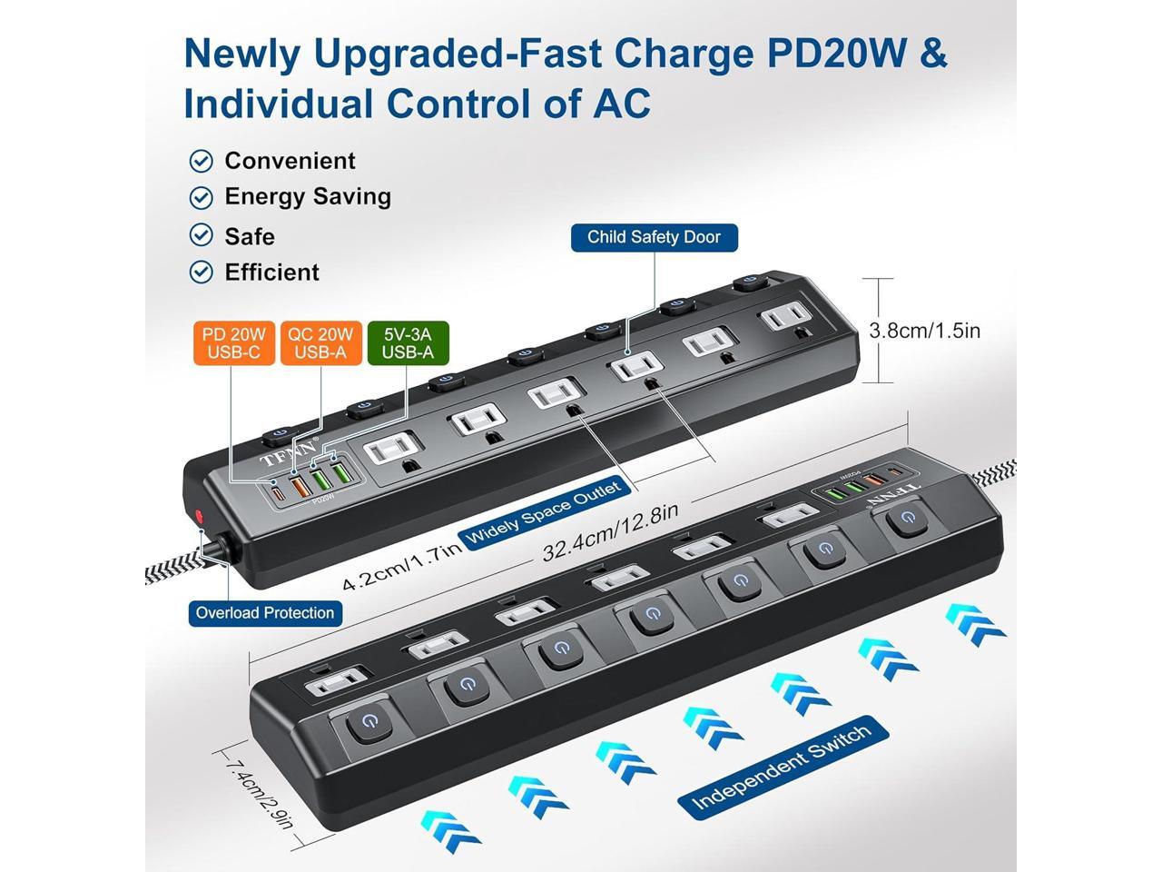 - 10-IN-1 Multi-Functiona Power SocketThe power strip has 6 AC outlets and 3 USB-A ports and 1 USB-C port (PD 20W), 4 USB ports total 70W output.The USB-C charging port adopts charging technology, which can adjust the output current for optimal charging. No converter is needed to charge cell phones and laptops, save space, organize your desktop and do PD 20W fast charging.