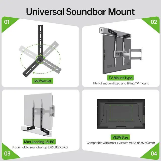 Wide Compatibility: The soundbar mount fits most sound bars with back /bottom holes and a load capacity of up to 16 lbs. Compatible with most TVs with horizontal VESA at 75-600mm.