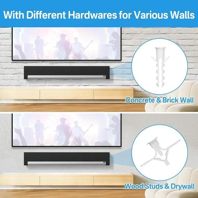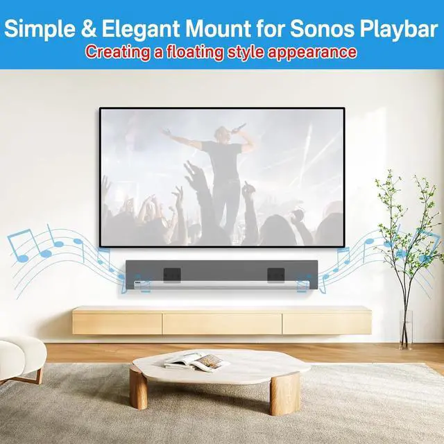 Simplified Installation This upgraded bracket for Sonos Playbar mount features a straight forward design. Unlike traditional brackets with multiple screws and complex three-piece setups, requiring just two easy steps to install, just cost your a few minutes that can enjoy the music. For worry-free installation, it comes with all the necessary hardware for various wall types, including drywall, wood studs, cement, and brick.