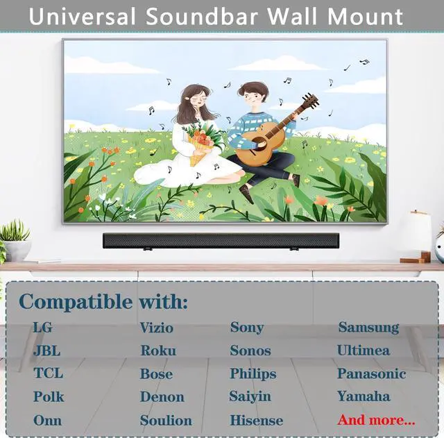 Universal Design: The universal sound bar mounts for Samsung, Sony, LG, Vizio, Bose, Onn, TCL, JBL, Polk Audio, Roku Streambar, Roku Streambar Pro, Harman Kardon, Denon, Rca, Nakamichi, Klipsch, Insignia, Majority, Panasonic, Hisense Soundbar and so on