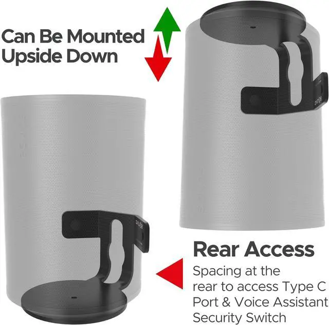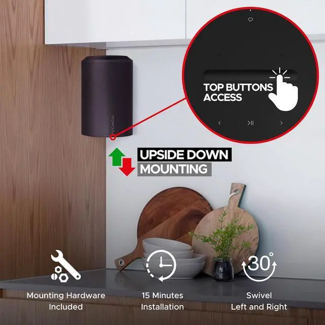 ENHANCED MOUNTING FLEXIBILITY: The mount' s versatility is a key feature, offering both standard and upside-down mounting options. This flexibility allows for easy access to the speaker' s touch controls and ensures optimal sound direction with a 30° swivel capability. Whether mounted traditionally or upside-down, it adapts to your space and listening preferences, making it ideal for corner placement to maximize room acoustics.