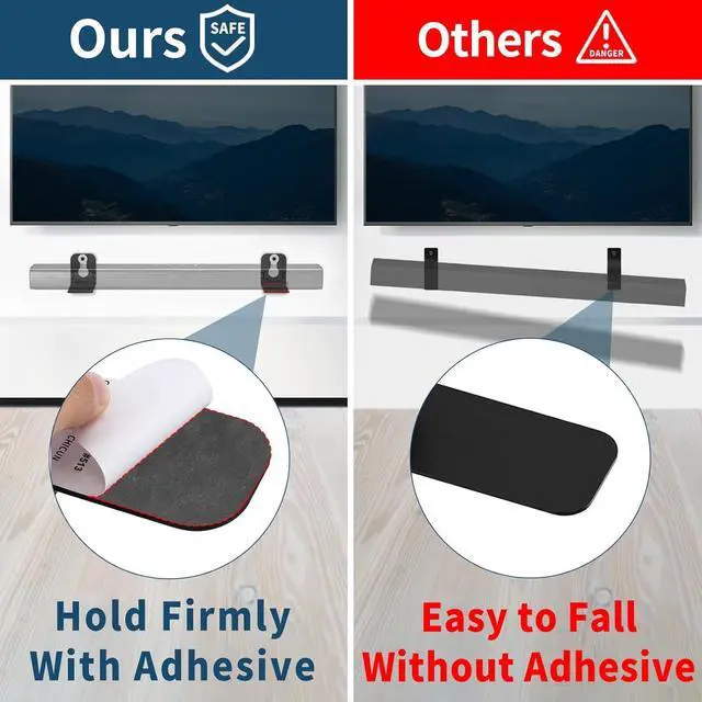 Hold Firmly & Heavy Duty - The mounting soundbar under TV with extra 2 pairs of adhesive stickies that can hold your soundbar firmly. The adhesive stickies with anti-slip strips can be assured that your soundbar will not fall off. It can hold sound bar weighing up to 30 Lbs and measuring up to 5.12 " in length.