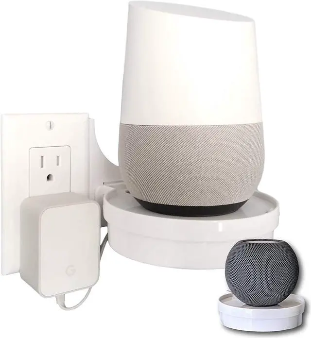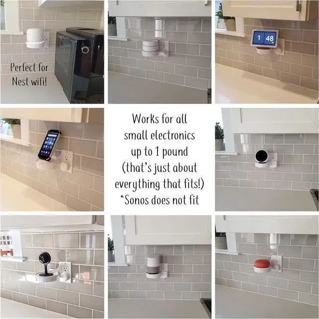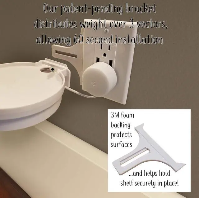 The first truly easy to install, great looking outlet shelf, designed to hold small electronics - cameras, wireless chargers, small smart speakers, wifi extenders, small video smart assistants, etc. up to 1 lbs. Works great with Apple Homepod Mini! DOES NOT HOLD FULL SIZE ECHO OR SONOS.