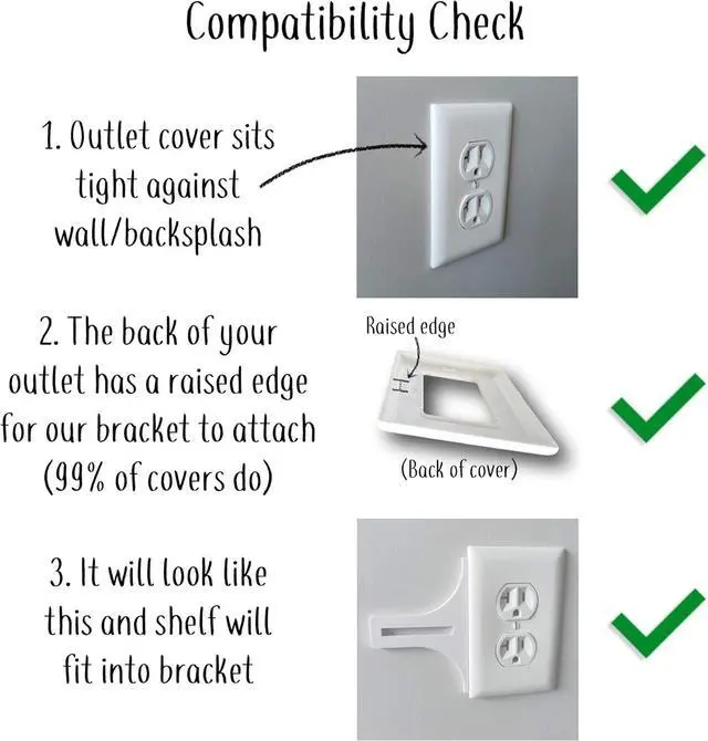 Works with your existing outlet cover and installs in just a few seconds using our patented pressure bracket. Please see the third photo to ensure compatibility. The Easy Outlet Shelf works with 99% of outlets and covers!