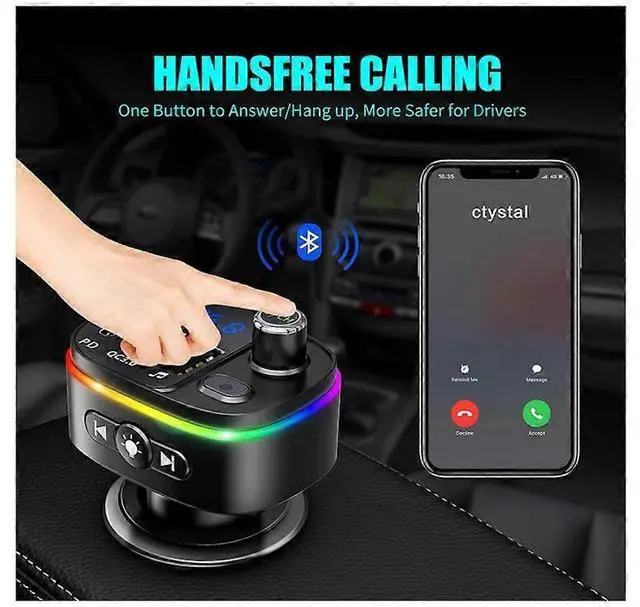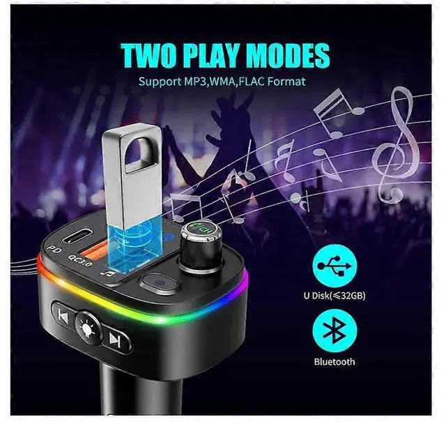 Upgrade your driving experience with this versatile Bluetooth car adapter and fast charger. Featuring PD 3.0 Type-C 18W and QC 3.0 charging for rapid power delivery, it keeps your devices charged on the go. Enjoy crystal-clear hands-free calls with Bluetooth 5.0 and CVC noise cancellation. Seamlessly connect via Bluetooth or USB drive (up to 32GB, supports MP3/WMA/FLAC) for high-fidelity music. Voice command support for Siri and Google Assistant enables safe operation while driving. Customize your ambiance with 9 RGB lighting modes, including static and dynamic options. Perfect for commuters, road trips, and daily use, this all-in-one device combines charging, music, and communication in one sleek unit.