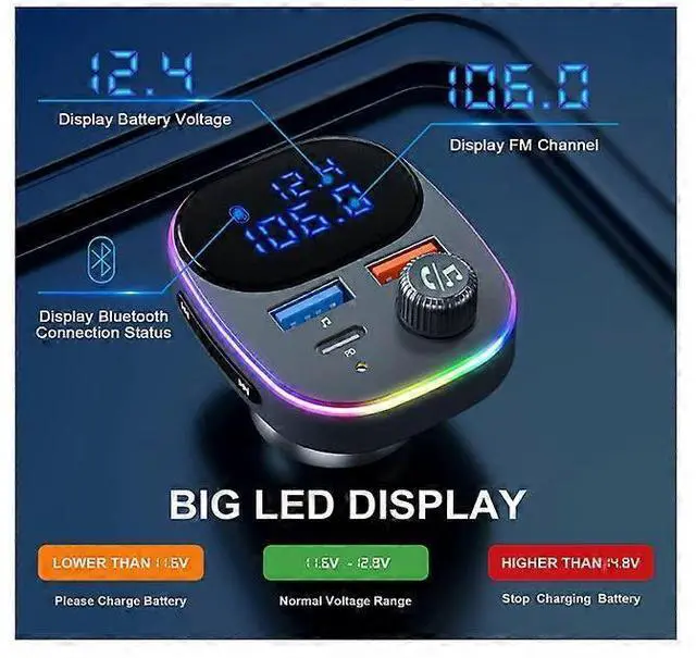 Large LED Display: Shows real-time vehicle voltage, FM channel, and Bluetooth status for easy monitoring