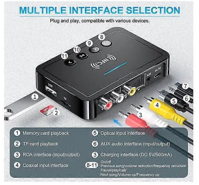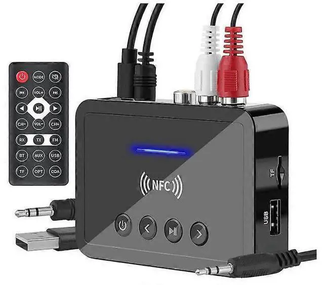 **Wide Compatibility**: Works with non-Bluetooth TVs, PCs, laptops, and car stereos via 3.5 mm AUX, RCA, optical, coaxial, USB, and TF inputs; includes NFC for quick pairing and a 5-8m remote control.