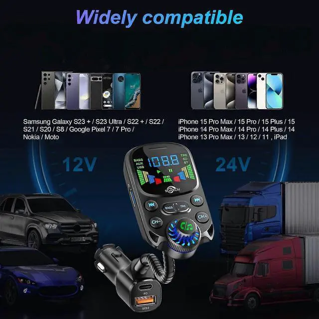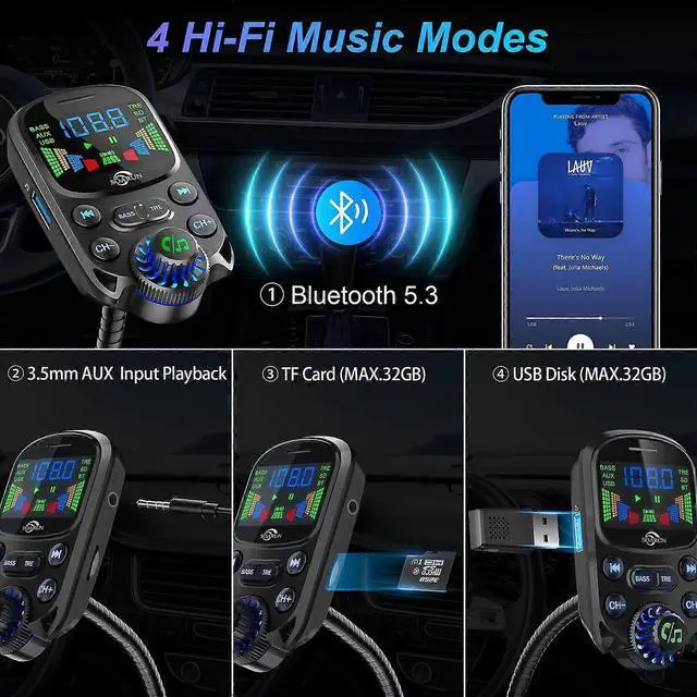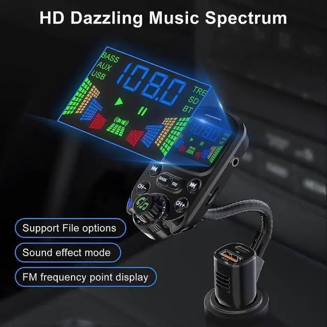 Upgrade your car audio and charging with our advanced Bluetooth 5.3 FM Transmitter. Featuring a 1.6 '' LED display and flexible gooseneck for optimal viewing, this device delivers superior functionality and safety.