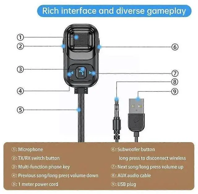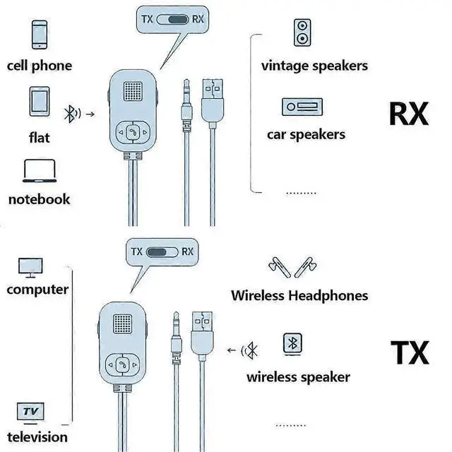 **Easy Setup & Wide Compatibility**: Plug the 3.5 mm AUX cable into your device's USB jack, select RX/TX mode, and enjoy wireless audio with car stereos, home systems, headphones, TVs, and PCs