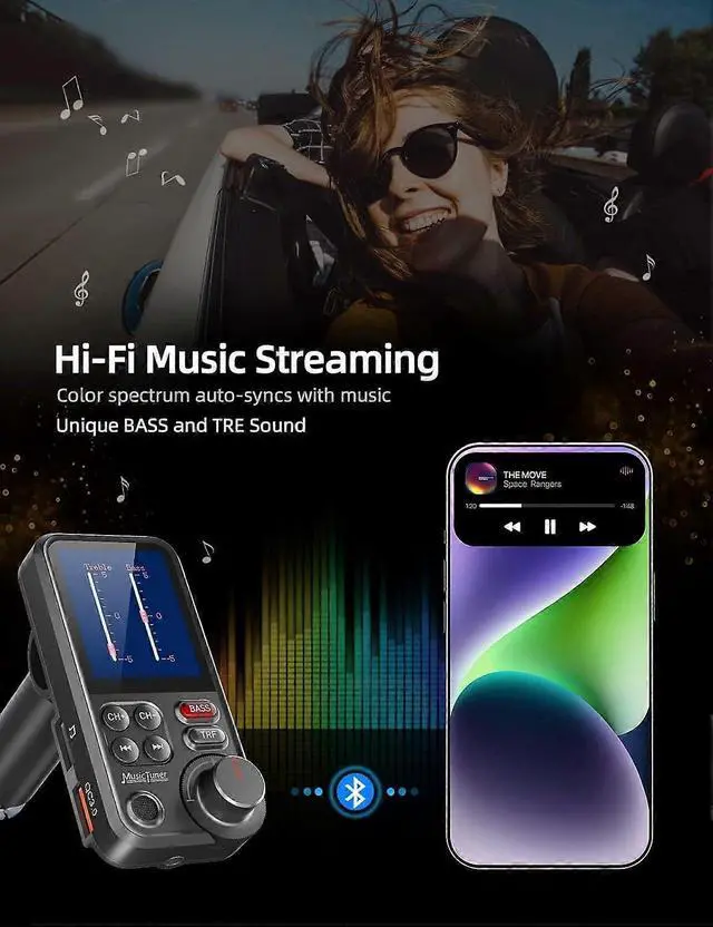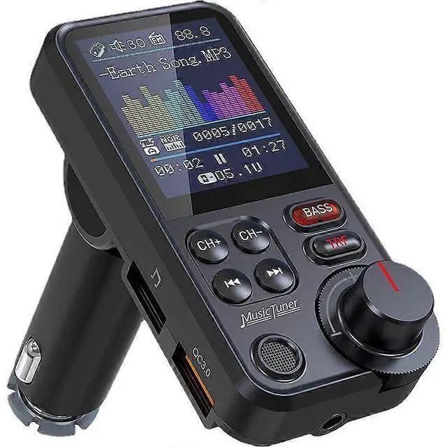 Upgrade your driving experience with the KM30 Bluetooth FM Transmitter, featuring a vibrant 1.8 -inch color screen and powerful microphone for crystal-clear hands-free calls. Stream music wirelessly via Bluetooth, microSD card, or AUX output with adjustable treble and bass modes. Enjoy rapid charging with the QC 3.0 port, delivering power 4x faster than standard chargers. Perfect for commuters, road trips, and daily drives, this compact adapter fits most car cigarette lighters (check dimensions: 20-24mm diameter, 65-70mm depth).