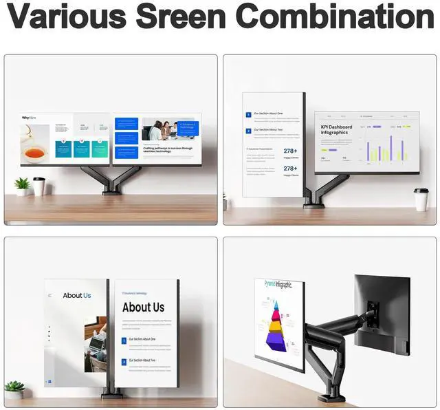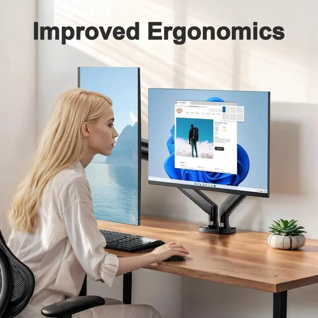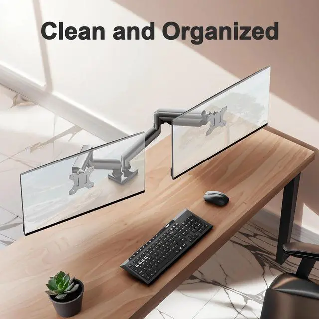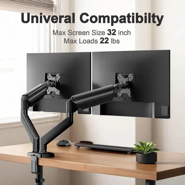 Universal Compatibility: This dual monitor mount supports 13-32 inch flat or curved screens, accommodating monitors up to 22 lbs per arm with VESA 75x75mm or 100x100mm patterns.
