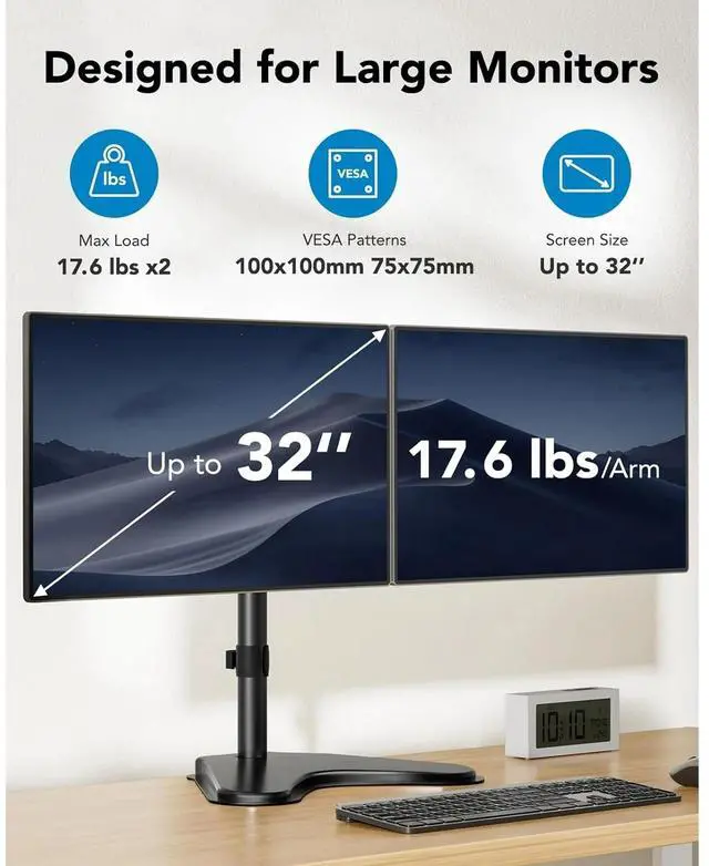 • Universal Fit: Compatible with 13 to 32 inch flat/curved LCD monitors, supporting up to 17.6lbs per arm.