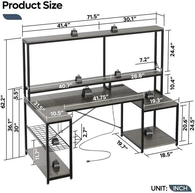 Ample Storage Space: The spacious 71.5" desktop with a monitor stand accommodates 3 monitors and 1 laptop The hutch provides additional display and storage space, while metal hooks keep headphones, bags, and keys organized