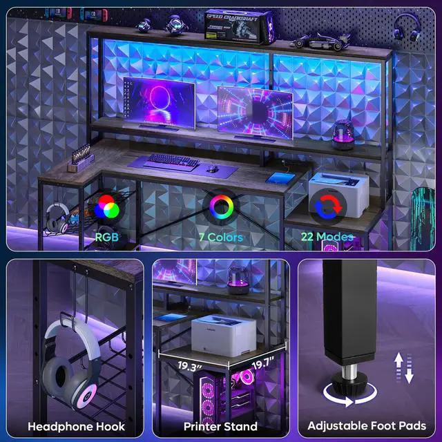 Bestier 71.5 inch Gaming Desk with LED Lights & Power Outlet, L Shaped Computer Desk with Hutch & Adjustable Shelves, Retro Grey Oak