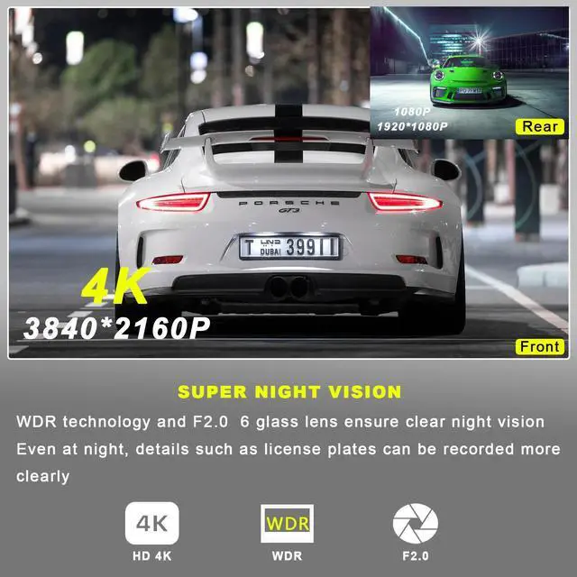 This dual lens dash cam provides comprehensive coverage of your driving environment with two separate recording channels. The cameras offer wide viewing angles between 130 and 150 degrees, effectively capturing both the road ahead and vehicle interior while minimizing blind spots.