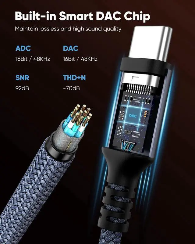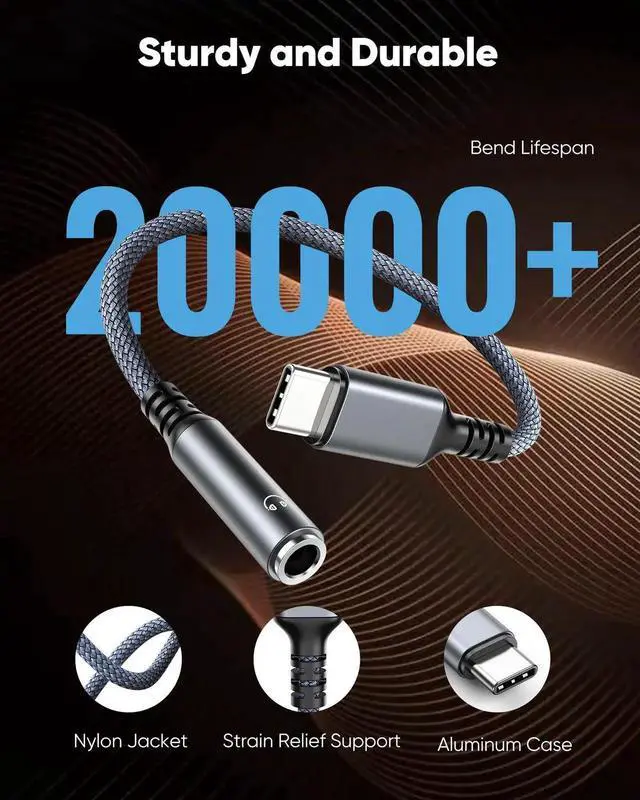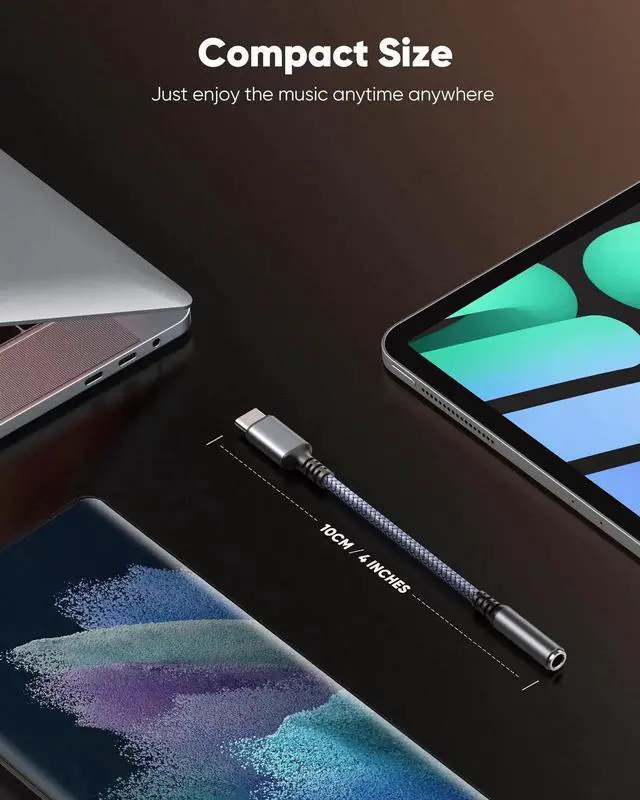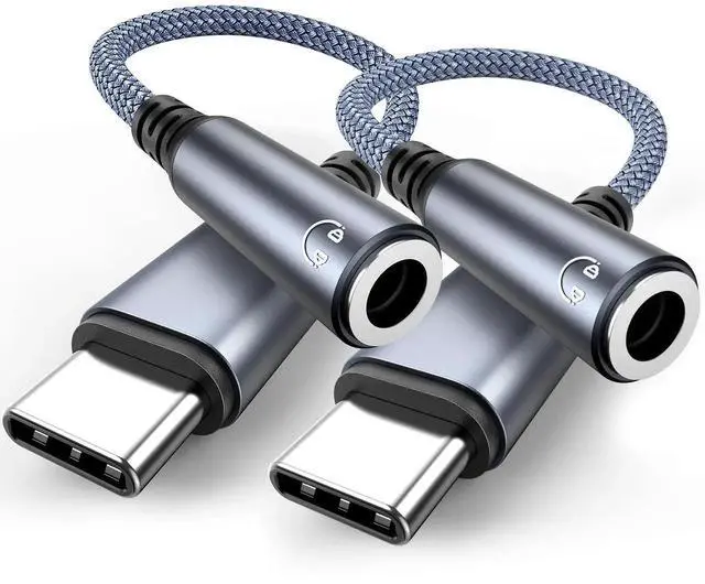 Introducing the USB Type C to 3.5mm Female Headphone Jack Adapter, a 2-pack multi-function dongle designed for devices without audio jacks. Compatible with most Type C devices including Samsung Galaxy S23, S22, S21, S20, iPad Pro, Pixel, and many more. This adapter allows you to listen to music and make calls with your headphones, headset, or speakers, and supports wire control for microphone volume, pause, and play music. The advanced DAC chip ensures high-fidelity sound quality with low power consumption and excellent decoding performance, supporting up to 16Bit/48Khz audio sampling rate. The reinforced classic high-quality materials, including military-grade tensile nylon and aluminum alloy shell, provide durability and resistance to twists, tugs, and tangles. For MacBook users, ensure the sound output source is set to USB Audio if no sound is coming from the headphones. Experience high-quality sound with this wide compatibility, lightweight, and durable USB C to 3.5mm audio adapter.