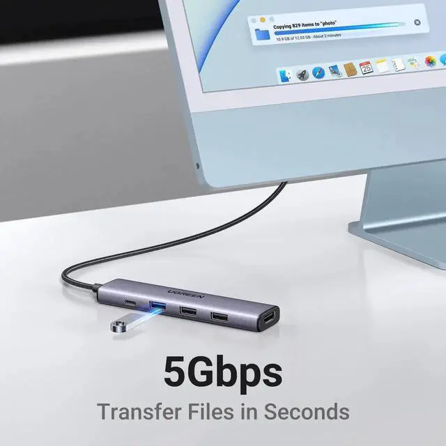 5 in 1 Connectivity: The USB C Multiport Adapter is equipped with a 4K HDMI port, a 100W USB C PD port, a 5 Gbps USB A data port, and two 480 Mbps USB A ports