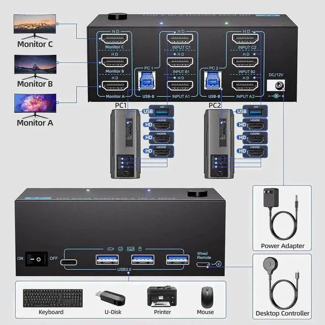 2 Switching Methdos: Triple monitors KVM switch driver-free and plug and play. you can press the button on the panel or use the wired remote controller (included in the package) to switch the computers. Two color lights indicate the active computer.