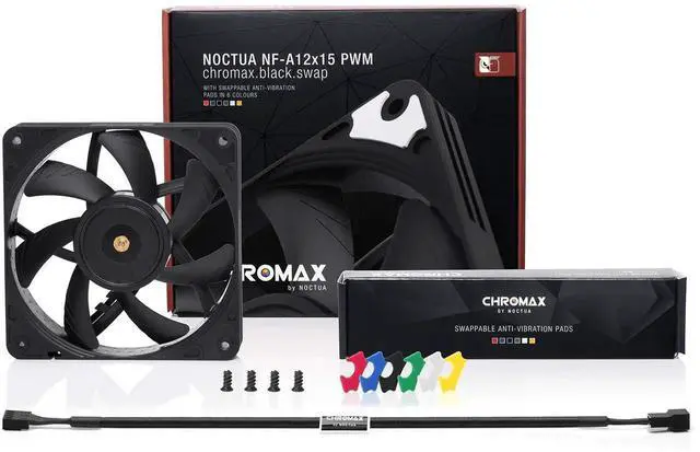 Having received dozens of awards and recommendations from international hardware websites and magazines, the NF-A12x15 has established itself as a default choice when it comes to premium-quality slim 120mm fans. The chromax. black. swap edition combines the NF-A12x15s signature quiet cooling performance with an attractive all-black design and a bundle of self-adhesive red, white, blue, green, yellow and black anti-vibration pads that allow the colour-customisation of the fan to match individual build colour schemes. Topped off with Noctuas trusted premium-grade SSO2 bearing and more than 150, 000 hours MTTF, the NF-12x15 PWM chromax.