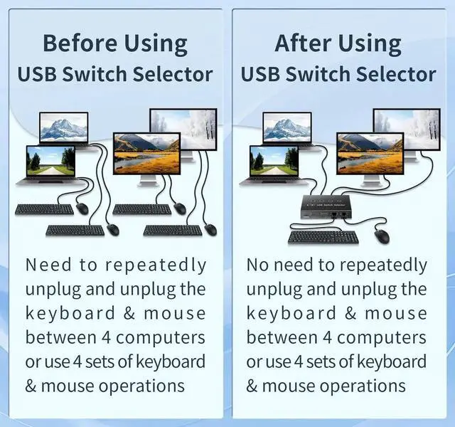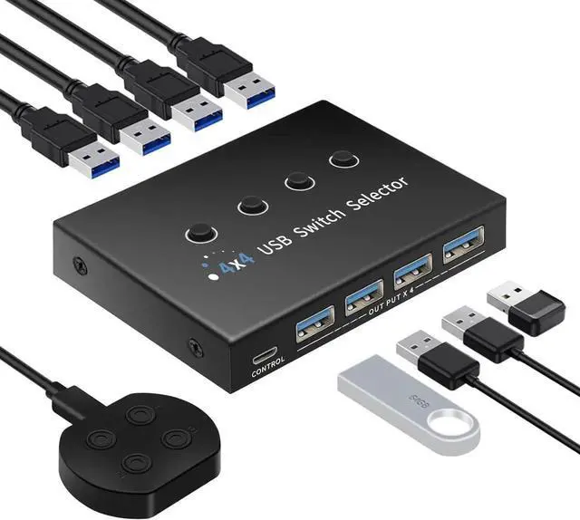 USB Switch 4 Computer Sharingthe 4 port USB switcher supports one set of keyboard and mouse to control up to 4 computers, sharing 4 USB 3.0 devices such as mouse keyboard, printer, removable hard disk and USB camera. One-click switching eliminates the need to constantly plug and unplug cables or set up complicated sharing software.
