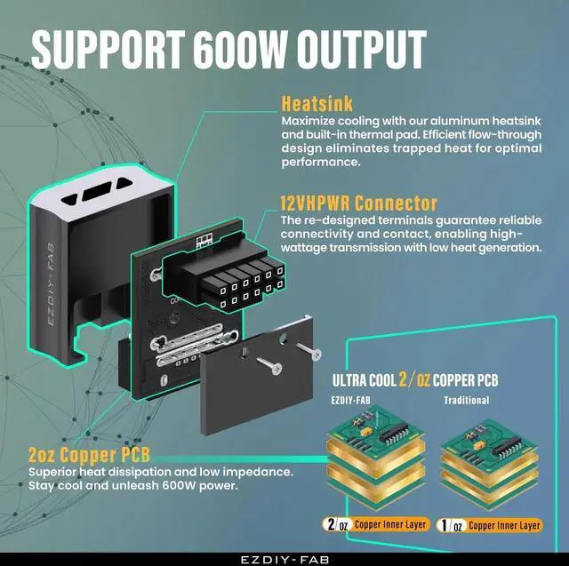 600W high-current operation supported by an aluminum heat sink and ventilation holes, ensuring stable performance with optimal heat dissipation efficiency.