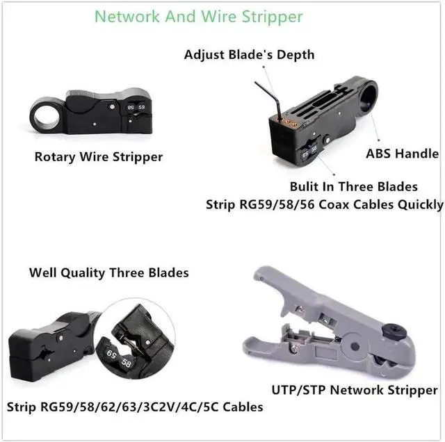 Wire stripper bulit in three blades, strip RG59/58/56/62/63/3V2V/4C/5C coax cables quickly; The cutter strip UTP/STP network