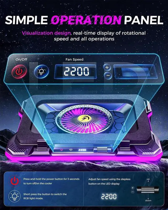 Efficient Cooling Performance: Equipped with a 5.5 -inch turbofan, this cooling pad delivers rapid cooling with adjustable speeds from 300-2200 RPM, ensuring optimal heat dissipation for laptops between 15.6 -19 inches. The laptop cooler weighs 1.24 kg and has dimensions of 16.85 x 12.44 x 2.28 inches ^^