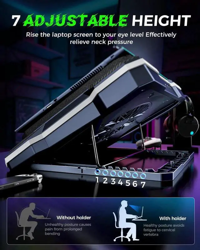 Design for Comfort: Featuring 8 adjustable height settings, this cooling pad offers a perfect ergonomic angle, helping reduce back and neck strain for long hours of work or gaming. ^^ Quiet and