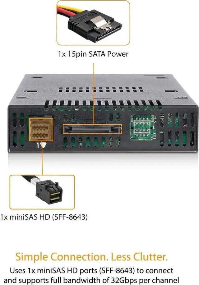 Uses a Mini-SAS HD port (SFF-8643) to connect, requires an NVMe host