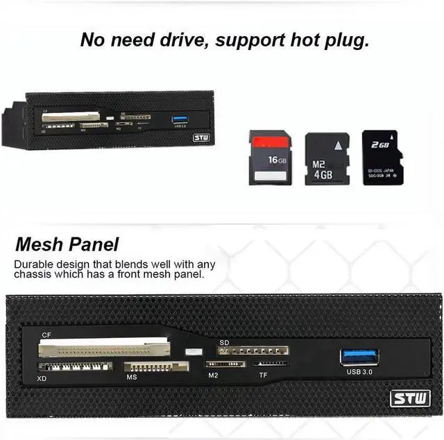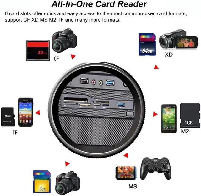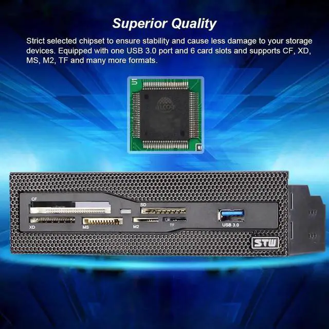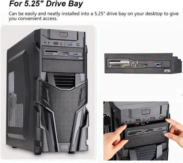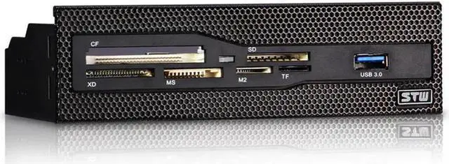 This is a multi-functional card reader that features one USB 3.0 port and 6 card slots. It supports CF, XD, MS, M2, TF and many more formats, and let you transfer files between your flash media and computer easily and quickly. Users can transfer files easily and quickly with high speed USB 3.0 interface as USB 3.0 allows up to 5Gb/s data transfer speed almost 10x faster than USB2.0. It can be easily mounted into 5.25" drive bay of your computer case for added card reading capabilities.