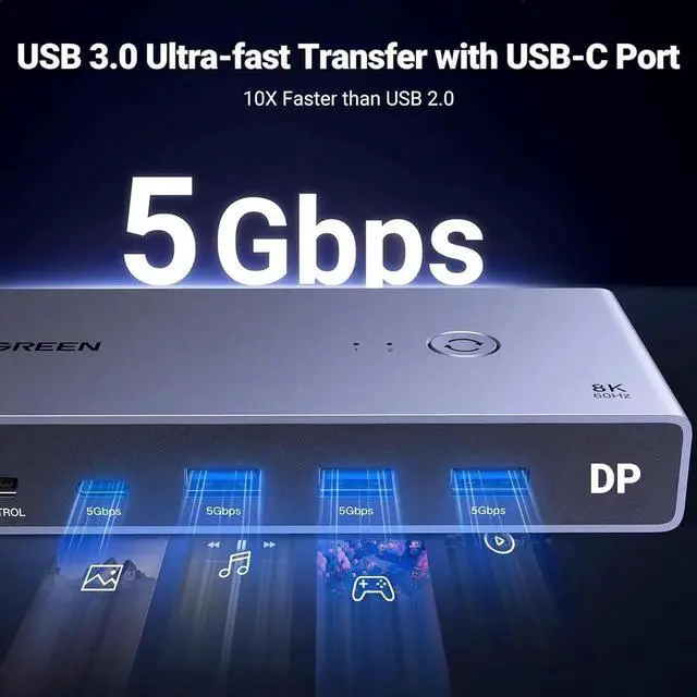 KVM Switch Displayport with 4 USB 3.0 Ports: This KVM DisplayPort 8K has 4 USB 3.0 ports (3 USB-A+1 USB-C) for sharing USB flash drives, printers, mobile hard drives, U disk, and other USB 2.0 and USB 3.0 devices. USB 3.0 offers data transfer speeds up to 5Gbps, while USB 2.0 is only 480Mbps. It allows faster file and picture transfer to make work and life easier and more convenient. NOTE: Please Ensure USB C Charging to the power source when connecting high-power equipment such as hard drive