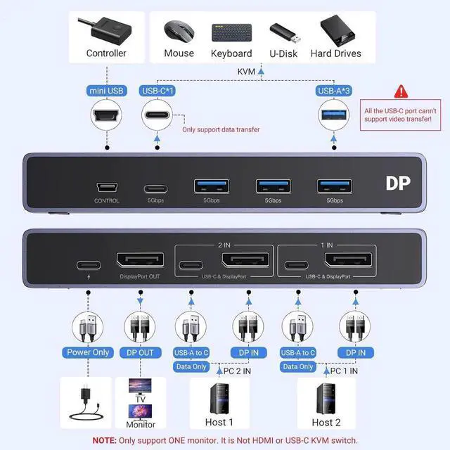Displayport KVM Switch 1 Monitor 2 Computers: This DP KVM switch allows 2 computers to share a monitor and 4 USB 3.0 devices such as a set keyboard, mouse, hard drives, U disk and printer, it's not only a DisplayPort Switch, but also is a keyboard mouse switch. You can easily switch between two hosts, which helps to maximize productivity. NOTE: Must Connect two USB A to C cables for the Power Supply and data transfer. It is NOT a USB-C KVM Switch