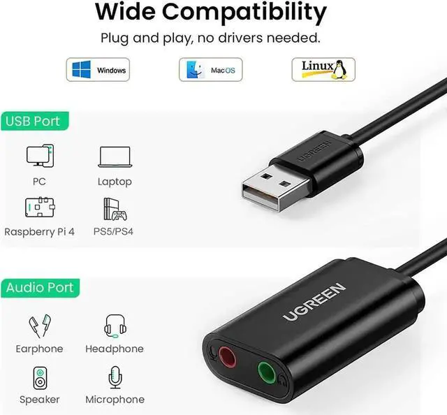 Ideal Sound Card Option : usb audio adapter is ideal to replace your faulty sound card or audio port, it adds a mono microphone-in and a stereo audio-out port to your computer through a USB port, which enables you to connect your existing headphones, headset, speakers, or microphone with 3.5mm jack to your PC through a USB interface.