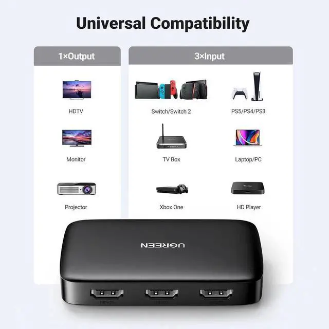 BROAD COMPATIBILITY: UGREEN HDMI splitter 3 in 1 out is only 3.6*2.1*0.7 inches in size making it extremely compact, saving you more space for your entertainment center unit. This HDMI switch adapter is compatible with TV, Switch/Switch 2, Stick/Fire Stick, PS5/PS4/PS3, Xbox, Laptop/PC, Blu-Ray and DVD players, HD-Ready, Full HD TVs, monitors, projectors, etc