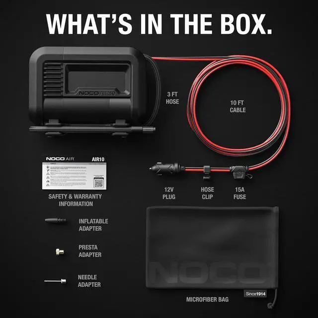 WHAT'S IN THE BOX AIR10 10-Amp Portable Car Tire Inflator with 3-Foot Braided Inflation Hose and a 10-Foot Power Cord with a 12V Cigarette Lighter Plug, Multiple Adapters (Presta Valve, Needle, and Inflatable Toy), Microfiber Storage Bag and 1-Year Limited Warranty.
