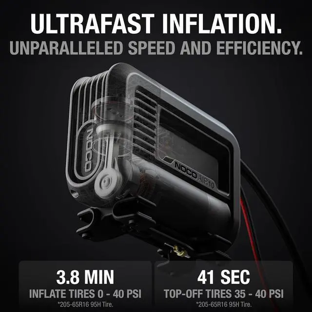 ULTRAFAST INFLATION Delivers 36 liters per minute of high-output airflow - far beyond typical inflators - to rapidly inflate from 0 to 40 PSI in just 3.8 minutes. Or quickly top-off low tires (35-40 PSI) in less than 41 seconds.