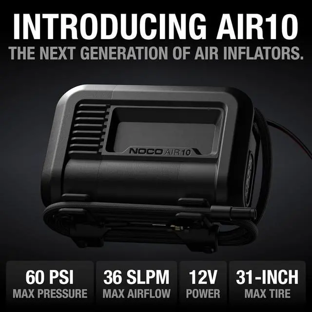 MEET THE AIR10 The next generation of portable air compressors utilizing advanced motor and airflow design with uncompromising performance for tires up to 31-inches. It runs longer, fills faster, and infinitely better.