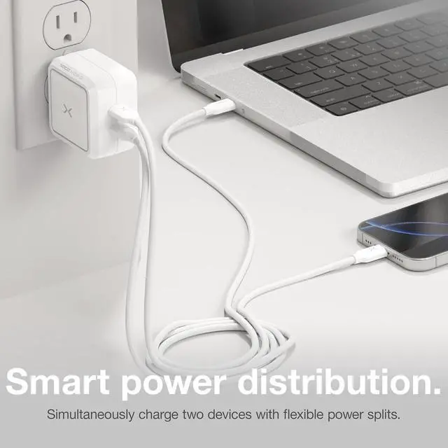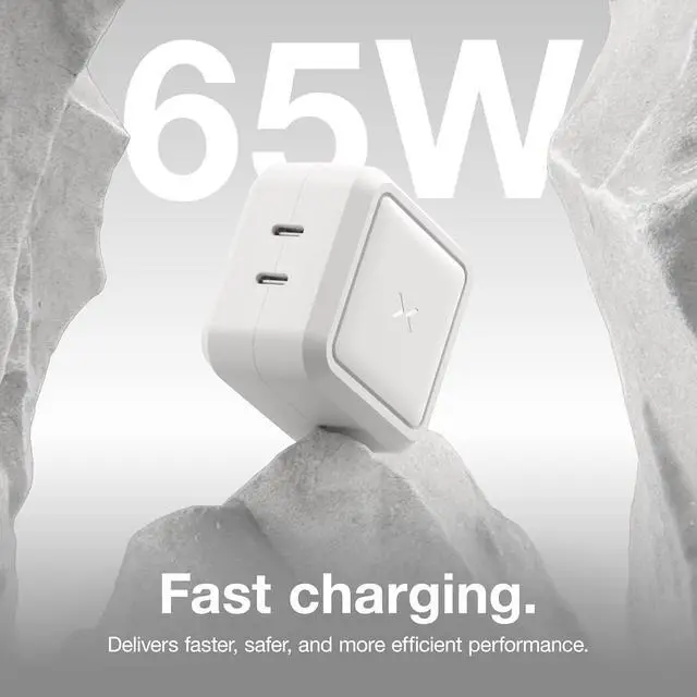 SMART POWER DISTRIBUTION Balances power across both ports to deliver the fastest charge to each device. Simultaneously charge two devices with flexible power splits: 65W/0W, 45W/20W, 30W/30W, 20W/45W, or 0W/65W.