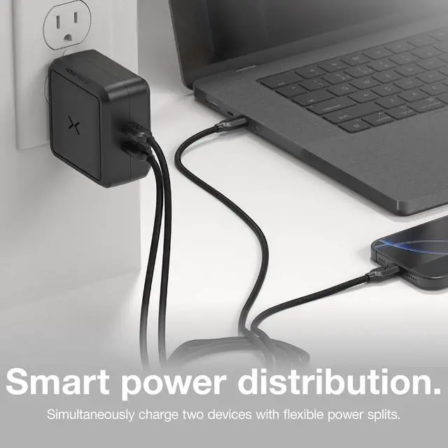 SMART POWER DISTRIBUTION Balances power across both ports to deliver the fastest charge to each device. Simultaneously charge two devices with flexible power splits: 100W/0W, 65W/30W, 45W/45W, 30W/65W, or 0!/100W.
