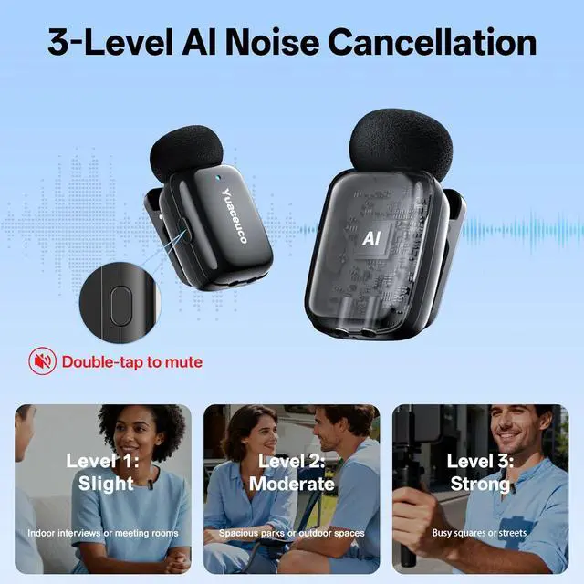 Level 3 AI Noise Cancellation and Mute: The mini wireless microphone has a built-in intelligent active noise cancellation chip. Single press the microphone button to conversion noise cancellation level. Record clear, distortion-free audio even in noisy environments. You can also double-click phone microphone button to turn on the mute function.