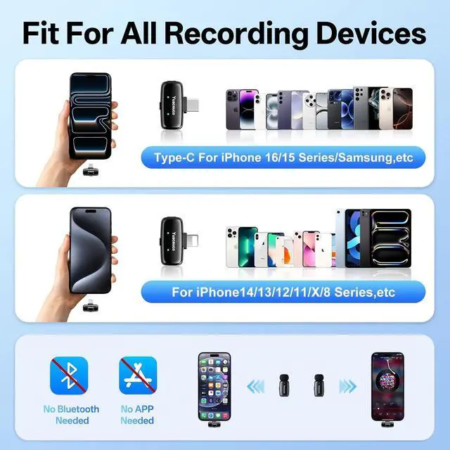 Plug and Play & 131 FT Transmission: The wireless lapel microphone is paired before leaving the factory, no app or setup required. TX and RX are automatically connected. The mic for iphone supports 40m (131 ft) of stable transmission, capturing expansive scenes with confidence.